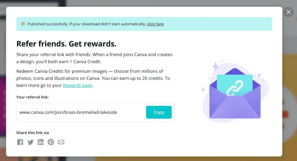 Ensure your (CTAs) are contextually relevant and seamlessly integrated into the user experience. A well-placed CTA that aligns with the user’s current activity can significantly boost engagement. Canva uses contextual CTAs effectively by suggesting users share referral links after they complete a design project, tying the CTA directly to the user’s recent positive experience.