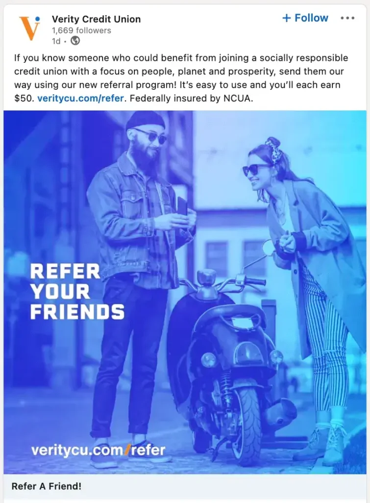 Verity Credit Union referral program advertisements on social media.