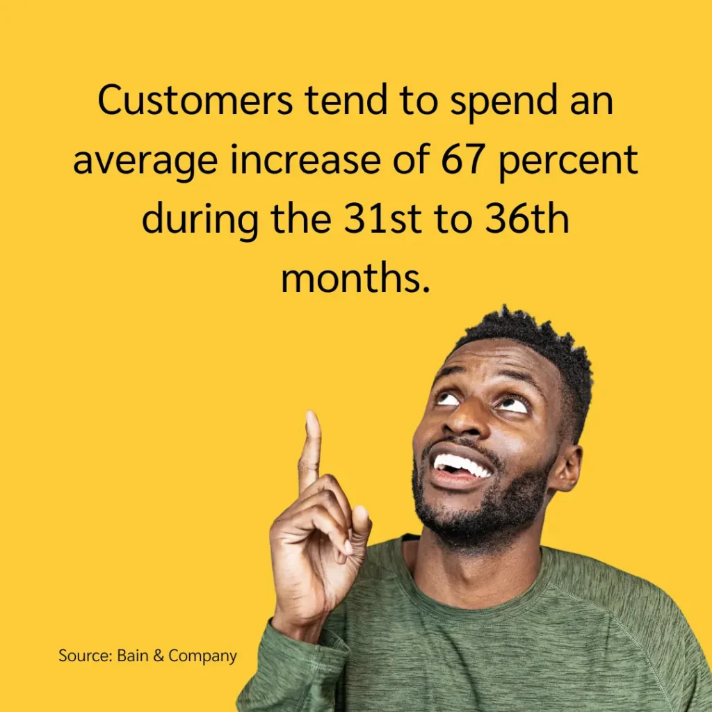 An engaged customer spends 67 percent more in months 31-36 of their relationship with a business than in months zero through six, highlighting the importance of efforts to keep the relationship active.