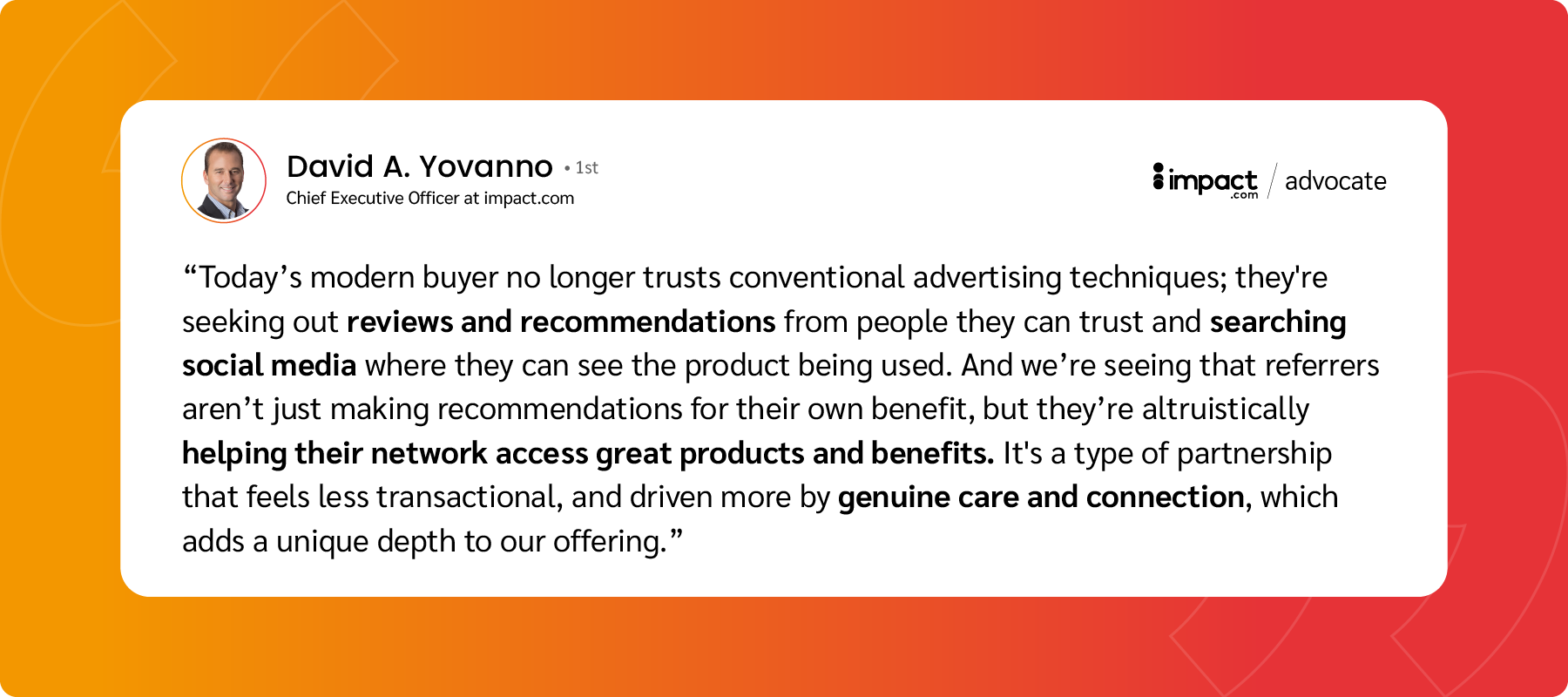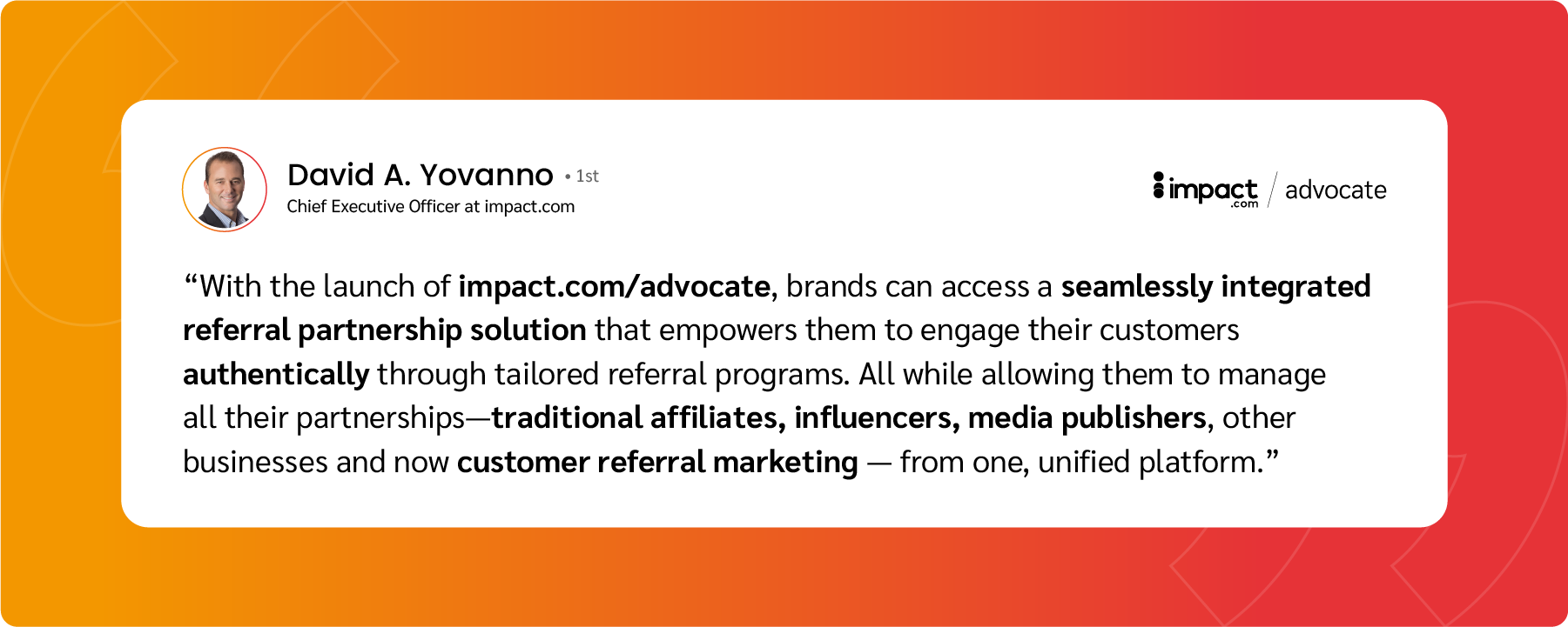 The new /advocate solution builds on discoverimpact.wpenginepowered.com’s 2023 acquisition of SaaSquatch—a best-in-class provider of customer referral software. Combining SaaSquatch’s and discoverimpact.wpenginepowered.com’s innovative platform allows brands to leverage customer referrals via discoverimpact.wpenginepowered.com’s existing suite of tools and technologies. This provides the most robust and comprehensive partnership marketing ecosystem on the market.