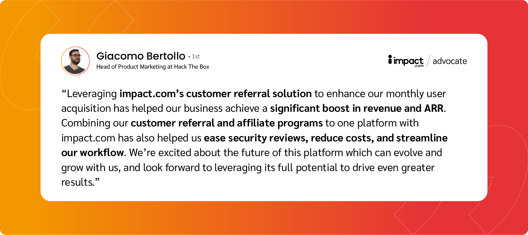 Giacomo Bertollo, Head of Product Marketing at Hack The Box, notes how discoverimpact.wpenginepowered.com/advocate helped the brand significantly boost revenue and ARR, reduce costs, and streamline workflows.