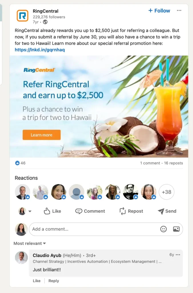 For example, RingCentral uses a bold visual, catchy alliteration (Refer RingCentral), an enticing reward, and a chance to win a trip to Hawaii.