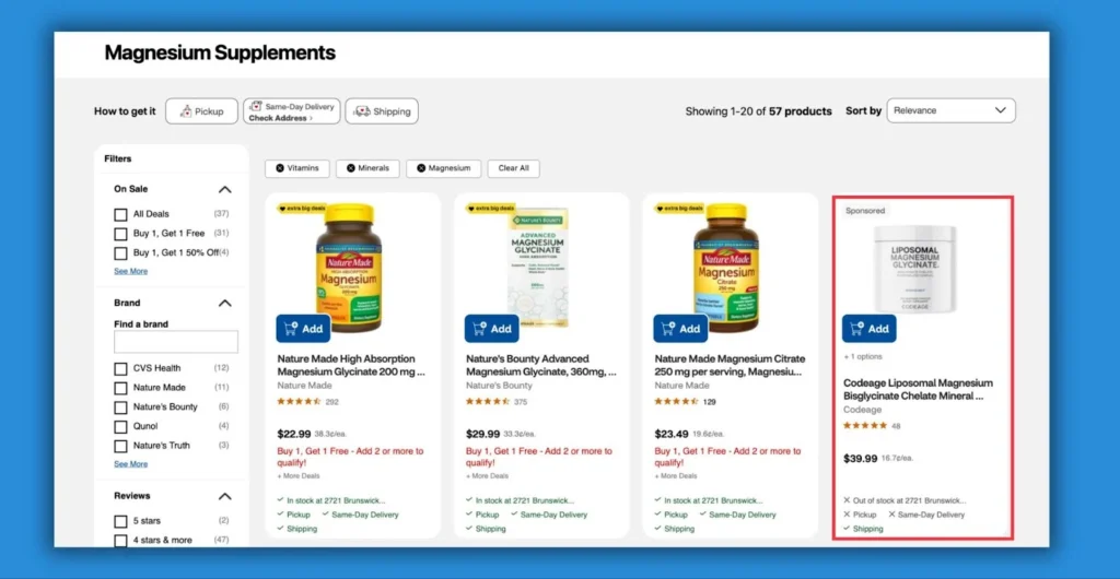 CVS incorporates sponsored product listings seamlessly into relevant product category lists.