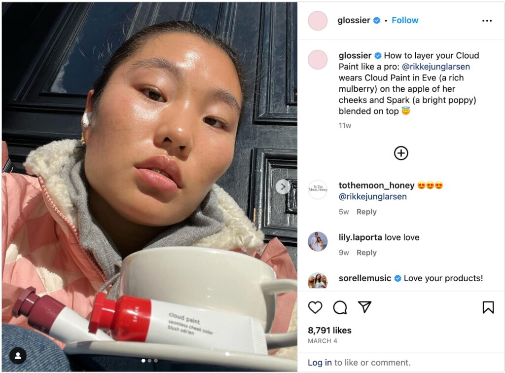 Questo approccio così spontaneo e autentico ha aiutato il brand a creare una community fedele di clienti. Glossier utilizza anche l’influencer marketing anche per i suoi account sui social media. Lo stile raffinato degli influencer e i contenuti UGC autentici si adattano entrambi perfettamente al pubblico di Glossier.